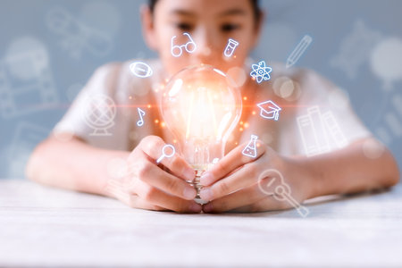 Girl holding light bulb with virtual education graduate icon. E-learning education, smart learning online with brainstorm, study knowledge, creative thinking idea concept.