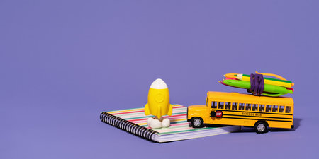 School bus with with pencils and pens on top on lilac purple background. Back to school. Delivery service and schedule. Assorted school stationery supplies. Yellow rocket. Neon acid colors banner