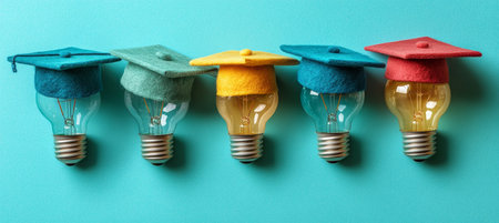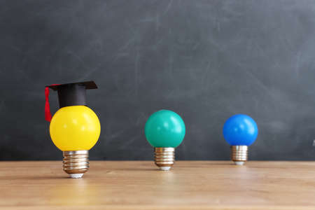 Light Bulbs with Graduation Hats on a Blue Background. Creative Education and Ideas Concept.
