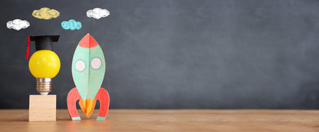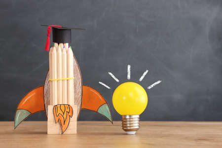 Education concept image. Creative idea and innovation. light bulb and rocket over blackboard background