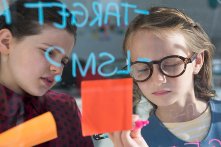 Businesswoman looking at female coworker writing on window seen through glass