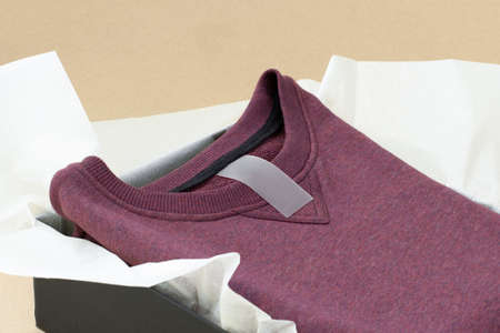 white matte transparent tag for size and instructions on the collar of the burgundy sweater in a black box and tissue paper