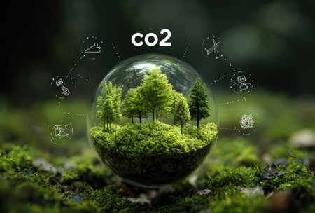 A visual representation shows a glass sphere containing trees and moss, symbolizing the environment. The image features a shallow depth of field, with green and brown tones dominating. The composition also includes surrounding icons connected to the sphere, suggesting ideas related to the ecological balance. This image could be used for conceptual projects or educational materials.
