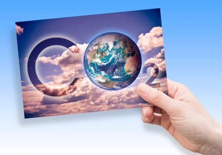 Presence of CO2 in the atmosphere - concept with a NASA planet Earth image against a cloudy sky - Concept with hand holding a postcard