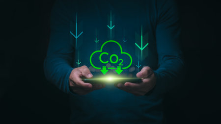 An image presents a person's hands interacting with a digital display showing CO2 levels. The visual incorporates graphs and a rising green arrow, suggesting an upward trend. The composition uses a dark, blurred background and a focus on the central subject, suitable for various editorial and commercial applications.