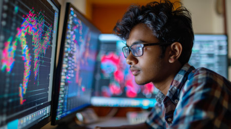 Young Individual Focuses on Computer Screens Displaying Complex Data Visualizations in a Cozy Workspace During Evening Hours. Generative AI