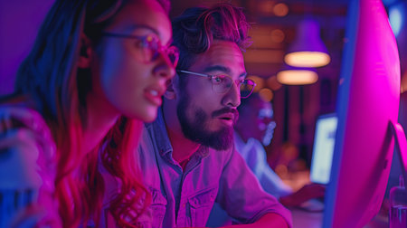 A close-up shot captures a laptop screen illuminated with lines of code. The display is the focal point, reflecting a purplish hue against a dark background. The scene suggests an indoor environment, possibly at night. Suitable for commercial projects or editorial content relating to coding or software development.