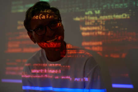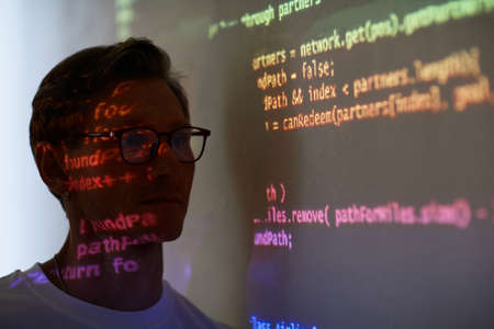 Portrait of Software Developer Hacker Working on Personal Computer, Projected Code Numbers and Characters Reflect on His Face. Dark Room Full of Electronics. Hacking and Programming Concept