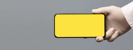 black phone in doctor hand with yellow screen for mockup, gray background