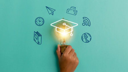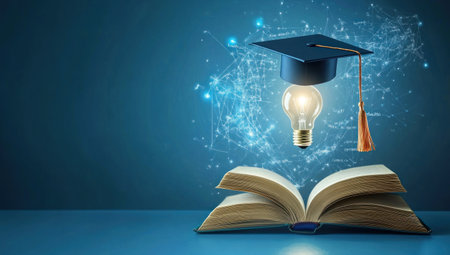 Elegant artwork of an open book with a lightbulb and graduation cap floating above, symbolizing knowledge and education. --ar 53:30 --v 6.1 Job ID: be53c20a-af70-4a6d-8049-4b940ddf5267