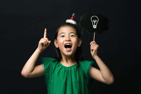 cute asian girl child dressed in a green dress holding an idea bulb stick with a christmas head decoration on a black background. I think a good idea