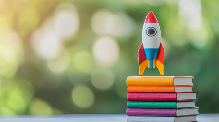 Colorful toy rocket on stacked books with blurred green background, education and creativity concept