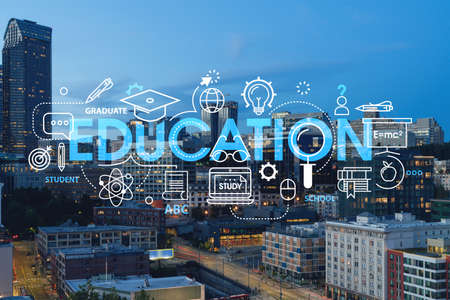 Seattle aerial skyline panorama of downtown skyscrapers at sunset, Washington USA. Technologies and education concept. Academic research, top ranking university, hologram