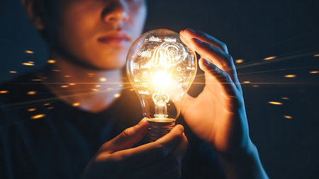 An individual's hand holds a glowing light bulb, the focal point against a blurred background. The image displays a mesh of light and sparks, with warm tones dominating. This suggests an idea of creativity and inspiration. It could be used for advertisements, presentations, or educational material.