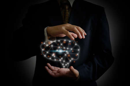 Brain representing artificial intelligence and businessman holding futuristic tablet. Data mining and another modern computer technologies concepts.