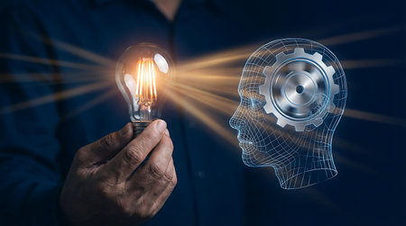 Businessman holding a glowing lightbulb with a human head and gear inside
