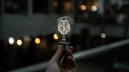 A person holds a lightbulb with a glowing brain inside, symbolizing innovation, inspiration, and new ideas.