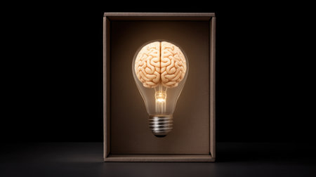 This striking image features a light bulb containing a brain, set in a minimalist box. It symbolizes the fusion of creativity and intelligence, perfect for innovation themes.