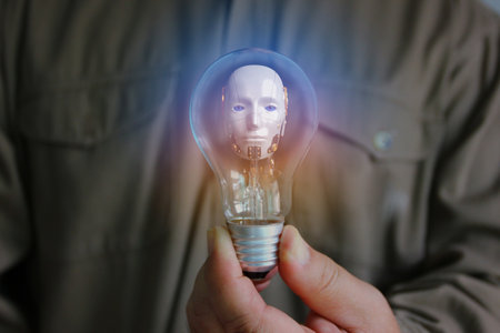 Concept illustration of the introduction of AI with the digital brain in a light bulb for AI against a person