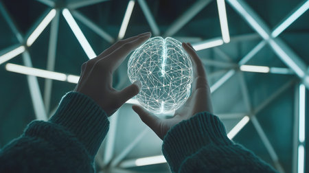 Hands holding a glowing digital brain with connected neural network lines, symbolizing artificial intelligence and futuristic technology.