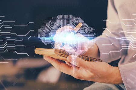 Creative light bulb with human brain hologram and hand writing in notepad on background with laptop, artificial Intelligence and neural networks concept. Multiexposure