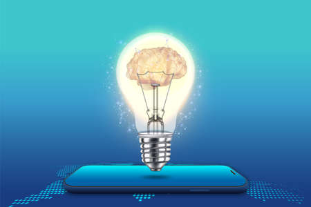 smartphone with brain bulb light isolated on blue background as idea, new technology and communication concept. vector illustration.