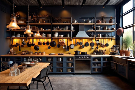 Background image of graphic kitchen interior with loft design elements, copy space
