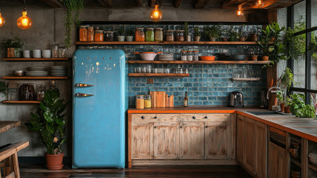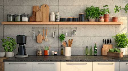 Stylish rustic kitchen interior with jars of ingredients, coffee machine, plants, and a tiled backsplash. The wooden countertop and neatly organized shelves create a cozy and inviting atmosphere.
