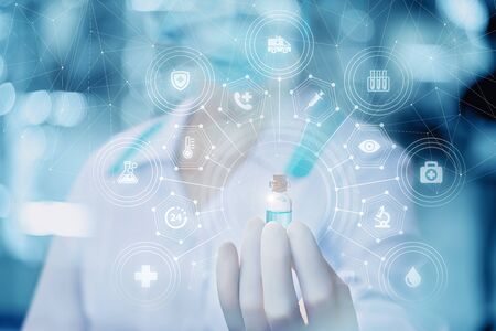 Close-up: scientist biotechnologist holding glass ampoule discover a new vaccine for brain, lung, and stomach Medical innovation and health technology