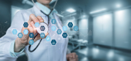 Health care and medical services concept with flat line AR interface.smart medical doctor working with stethoscope