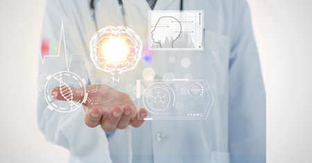Doctor analysis and checking brain testing result of science and medicine laboratory diagnostics with virtual computer interface,