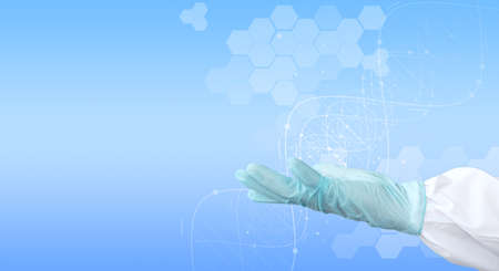Scientist hand working with science icon on blue background. 3D rendering