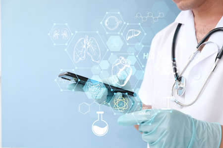 Doctor hand holding virtual screen with medical icons on blue background, closeup