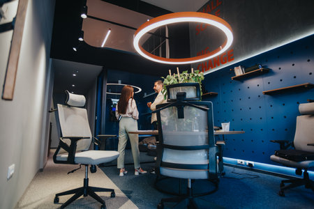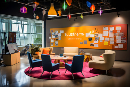The image showcases a modern office space, featuring a colorful design with contemporary furniture and decor, perfect for advertising or editorial content.