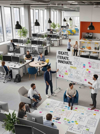 A bustling workspace where teams collaborate creatively showcasing modern office design and teamwork.