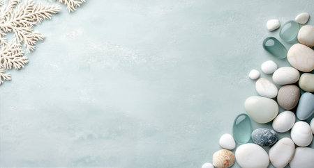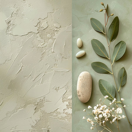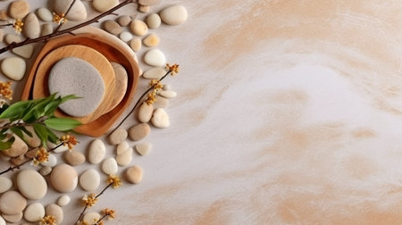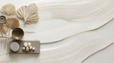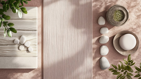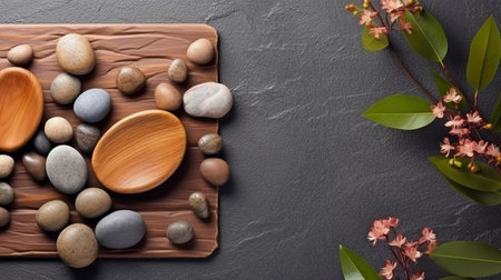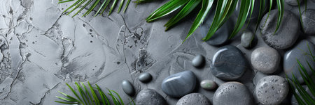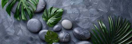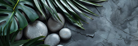 Zen-inspired background featuring smooth stones, tropical leaves, and gray textures for a calming effect.