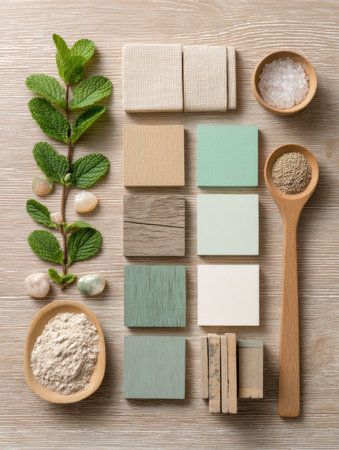Natural materials and color swatches are artistically arranged alongside fresh mint leaves and salt, showing texture and color combinations for design ideas.