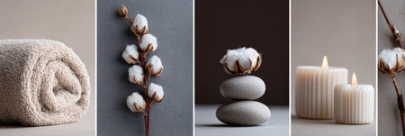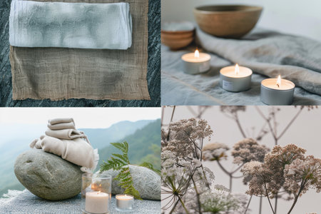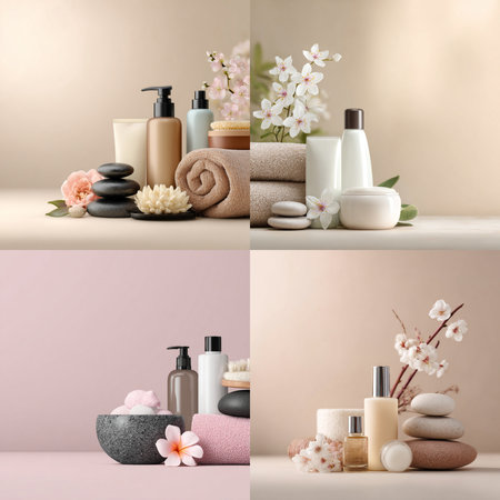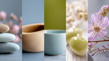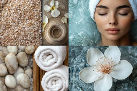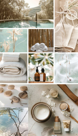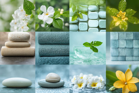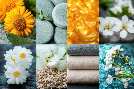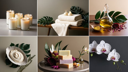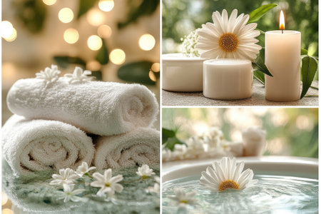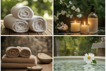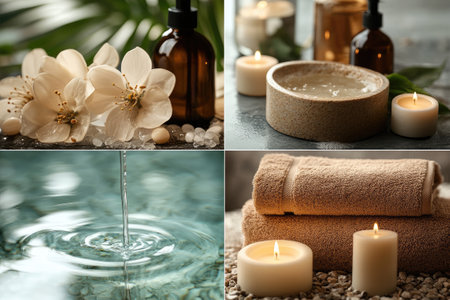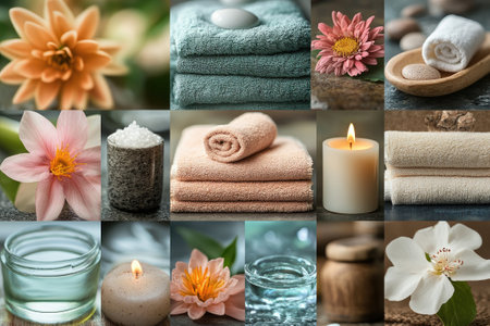 Collage showcasing spa essentials like soft towels, aromatic candles, vibrant flowers, and soothing oils, creating a serene atmosphere