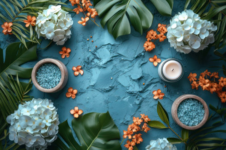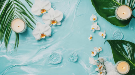 Tropical flowers and skincare items are arranged artistically on a blue surface, bathed in soft natural light, creating a calming aesthetic for wellness.