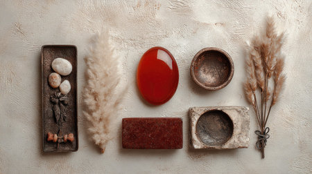 A serene flat lay featuring earthy elements including smooth stones, a vibrant red gemstone, and soft grasses, perfect for creative projects or decor.