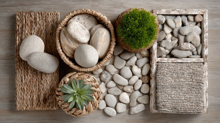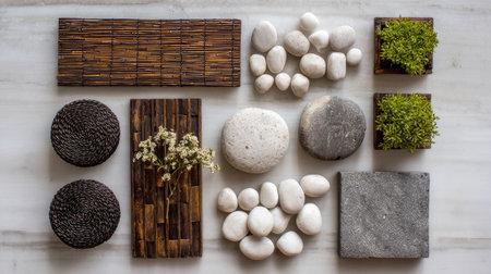 A serene composition featuring a variety of natural elements including bamboo, stones, and small plants arranged artfully on a neutral surface, ideal for decor.