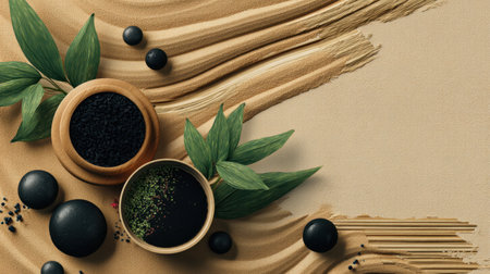 Natural ingredients black seeds green leaves wooden bowls smooth texture wellness concept organic products spa treatment herbal remedies earthy tones