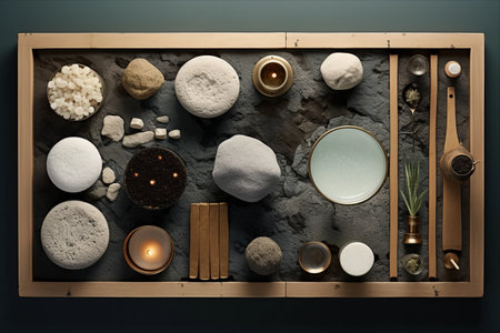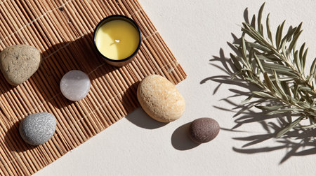 Discover a serene arrangement of spa elements showcasing natural stones, soothing candles, and fresh herbs, perfect for promoting relaxation and wellness in a tranquil setting.