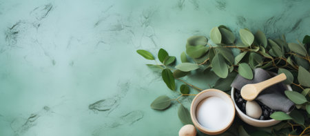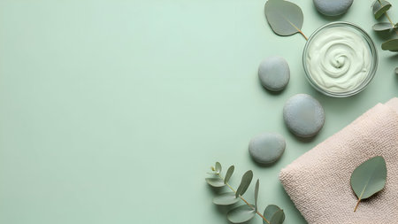 A collection of spa and wellness items with eucalyptus leaves on a soft green background