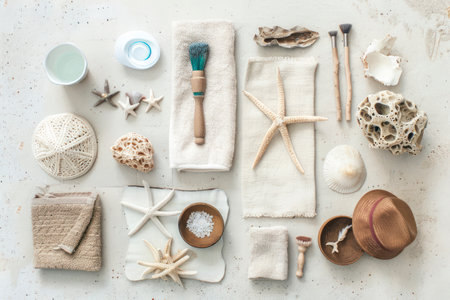 Beach essentials arranged in a flat lay, capturing the spirit of summer and coastal adventures.