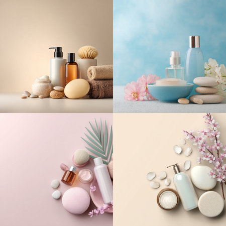A gentle and elegant composition of spa and cosmetic products including lotion bottles, cream jar, and soft towels. Set against a soothing, pastel-toned background with delicate floral accents. Perfect for skincare, beauty, or wellness branding. The minimal aesthetic and relaxing color palette evoke calm, purity, and feminine care – ideal for product presentations or advertising