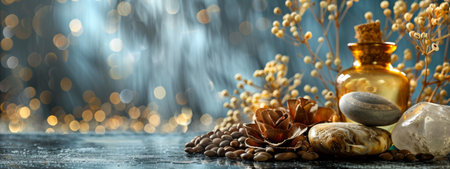 A tranquil arrangement of spa stones, dried flowers, and an amber bottle, set against a blurred bokeh background. The soft lighting and warm colors convey a relaxing and peaceful spa experience.