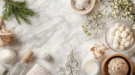 A flat lay of spa essentials including bath salts, flowers, and natural elements arranged on a white marble surface, evoking calm and relaxation.