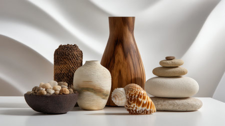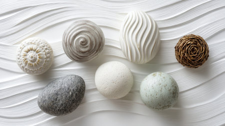 This image features a harmonious collection of decorative natural objects arranged thoughtfully against a soft white background, emphasizing their unique textures and forms.
