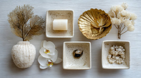 This serene flat lay features a harmonious arrangement of decorative ceramics, natural elements, and floral accents, perfect for inspiring home decor and styling ideas.